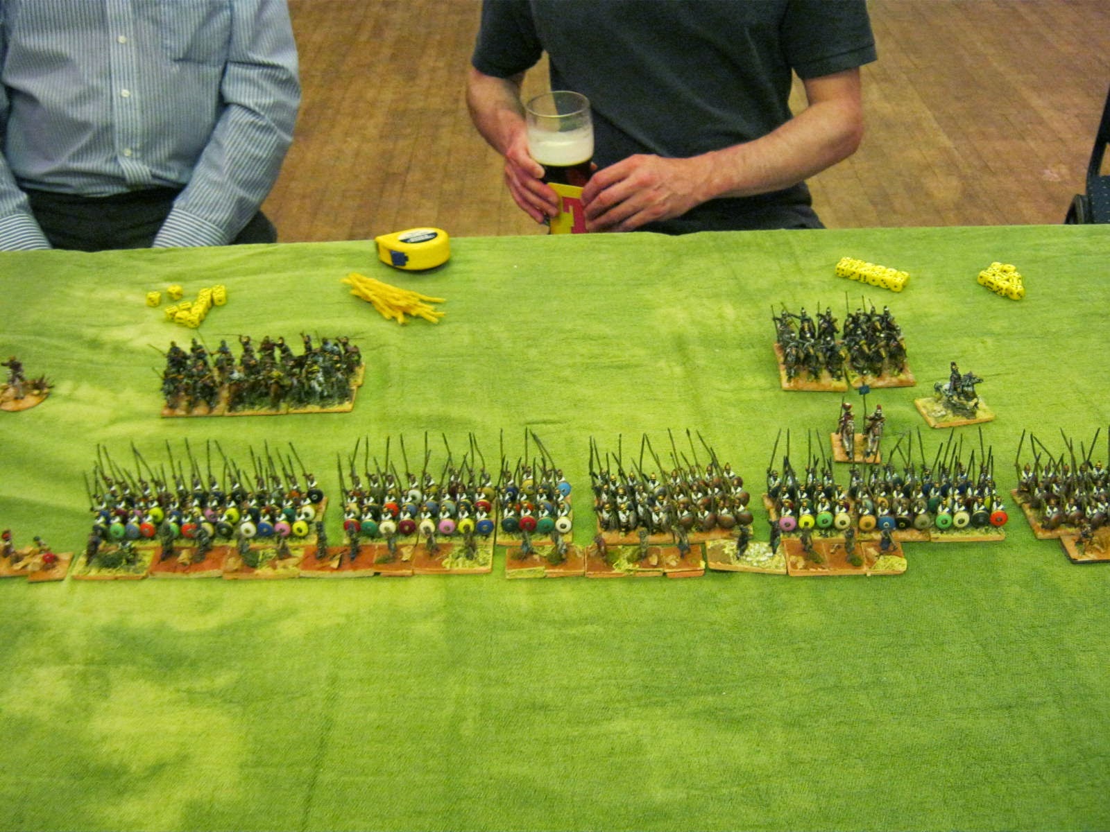 Gordon set up the Egyptian army and commanded their centre: a lot of mediocre Machimoi phalangites, somewhat stiffened with a couple of smaller heavy pike units. Skirmishers out front. Note the two cavalry units held in reserve.